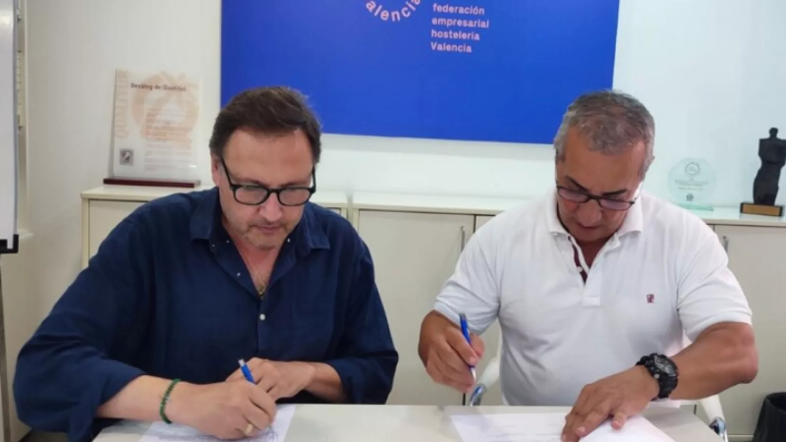 El presidente del Consejo de Enfermería de la Comunidad Valenciana (Cecova), Juan José Tirado, y el presidente de la Confederación Empresarial de Hostelería y Turismo de la Comunidad Valenciana (Conhostur), Manuel Espinar, han rubricado un convenio para asesorar y difundir la técnica de la Maniobra Heimlich en todo el sector de la hostería.