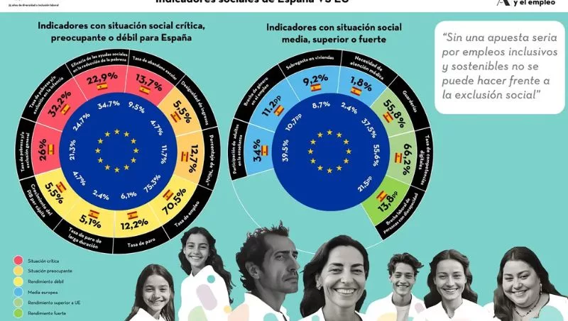 De todos los indicadores analizados, son cuatro los que presentan un nivel de riesgo y/o criticidad especialmente acusada: abandono escolar (13,7%, frente al 9,5% de la UE); tasa de riesgo de exclusión social (26% en España y 21,5% en la UE); pobreza infantil (32,2% frente al 24,7% de la UE) y eficacia de las prestaciones sociales para la reducción de la pobreza (17% frente al 41% de la UE).