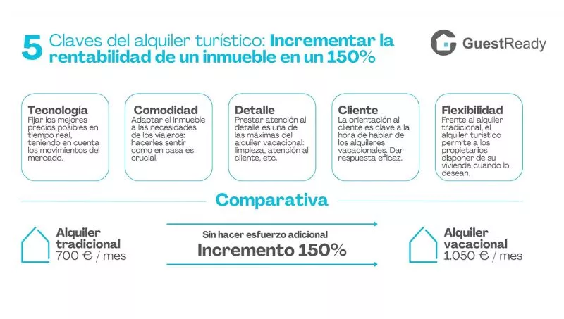 Tras la pandemia provocada por el COVID-19, y ante el auge de los conocidos como “nómadas digitales”, los alquileres vacacionales se sitúan, cada vez más, entre las prioridades de viajeros y turistas a la hora de hospedarse en un destino. Los expertos de GuestReady subrayan la importancia de ofrecer servicios de calidad que se adapten a las nuevas necesidades de los huéspedes como el internet de alta velocidad o un espacio para poder trabajar de manera cómoda. De igual manera, cosas tan simples como un sofá o cama confortables, así como dejar pequeños obsequios en la vivienda, pueden marcar la diferencia.