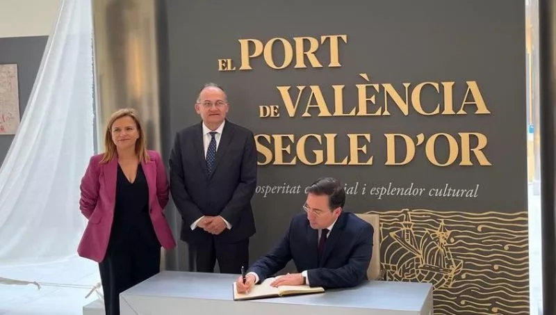 El ministro, acompañado por la delegada del Gobierno, Pilar Bernabé, y el presidente de la Autoridad Portuaria de València (APV), Joan Calabuig, ha dejado una dedicatoria en el libro de firmas de esta muestra que hace un recorrido por la València medieval y época dorada del esplendor cultura, social y comercial del Cap i Casal.